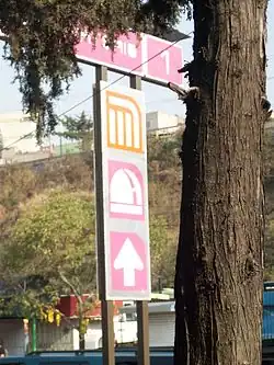 The station logo represents the stylised dome of an astronomical observatory.[2] It is named after an observatory that was built by the Universidad Nacional Autónoma de México at the top of a hill near the station.[7][8] However, due to the light pollution that came as a consequence of urban growth hardly any observations were done in the observatory, and thus it was transformed into a planetarium. Previously on the site was a colonial palace that belonged to the city's Bishop.[2]