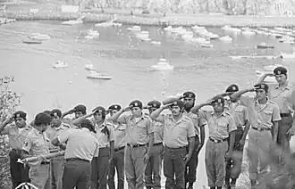 A little more than three weeks after the occupation's beginning, policemen from the Los Angeles County Sheriff's office came to enforce an "illegal zoning ordinance" on September 22, 1972.[8] The Brown Berets did not resist and were escorted off the island. A local anecdote asserts that the Berets chanted "Chicano Power" while departing, while the white townspeople sang "God Bless America."[9] At their departure, Mayor Rydell wrote, "living in the same town with these soggy, chocolate soldiers for three weeks was not pleasant for anybody."[1]
