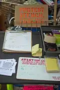 An additional protest site was set up at Justin Herman Plaza on the evening of October 15, 2011. The San Francisco police and city workers dismantled the camp the next evening because it was in violation of city codes. Five protesters were arrested.[6] The camp was rebuilt the next day, on October 17, 2011. Protesters attended the San Francisco Police Commission meeting on October 19, 2011, to protest their treatment on October 15. An initially contentious meeting ended when Police Chief Greg Suhr told the protesters that he is working with Mayor Ed Lee to provide port-a-potties and hand washing stations at Justin Herman Plaza.[7]