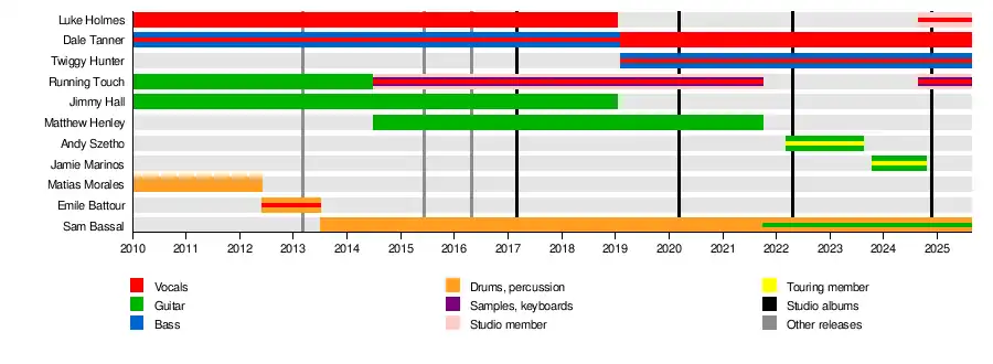 On 3 February 2019, the band released a teaser for their new member in the style of the Tony Hawk's Pro Skater character selection menu.[18] On 4 February 2019, they premiered a new single, 'Ask for the Anthem' and announced the addition of Twiggy Hunter to the lineup as bassist and backing vocalist, with Dale Tanner moving to full-time frontman.[19] On 1 October 2021, the band announced the departure of live guitarist Matt Henley.[20]