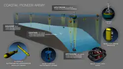 The Coastal Pioneer Array is a network of platforms and sensors that operate on the continental shelf and slope south of New England. A moored array was centered at the shelf break in the Mid-Atlantic Bight south of Cape Cod, Massachusetts. In 2024, the Coastal Pioneer Array was relocated to the southern Mid-Atlantic Bight, between Cape Hatteras and Norfolk Canyon off the coast of North Carolina.[24]
