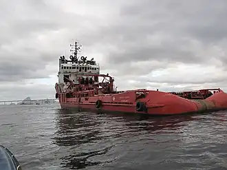 On 21 July 2019 SOS Méditerranée announced a new rescue campaign off the Libyan coast, using the supply vessel Ocean Viking.[2] The approach is supported by the Norwegian authorities, who have given the vessel a flag.[3] The operation costs €14,000 per day.[4] The vessel, which is 69 m long by 15 m beam, was built in 1986 to serve as a support vessel for oil rigs in the North Sea. It is operated by around thirty people (nine crew members, a search and rescue team and medical personnel)[3] and can carry up to 200 passengers.[5] It is faster and better equipped than the Aquarius.[6] Onboard microphones and cameras will make it possible to record everything that happens on board and around the boat, in order to possibly prove that the work was carried out within a legal framework[7][8] The ship, which will respect[9] the ban on disembarking migrants in Italian ports[10][11] is even banned from refueling in Malta.[12]