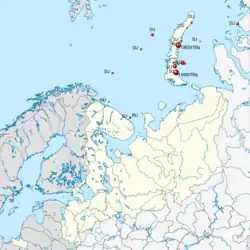 Mainly at the east coast of Novaya Zemlya at Kara Sea and relatively small proportion at Barents Sea by the Soviet Union. Dumped at 20 sites from 1959 to 1992,[11] total of 222,000 m3 including reactors and spent fuel.