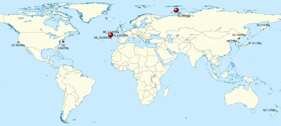 The countries involved – listed in order of total contributions measured in TBq (TBq=1012 becquerel) – were the Soviet Union, the United Kingdom, Switzerland, the United States, Belgium, France, the Netherlands, Japan, Sweden, Russia, New Zealand, Germany, Italy and South Korea. Together, they dumped a total of 85,100 TBq (85.1x1015 Bq) of radioactive waste at over 100 ocean sites, as measured in initial radioactivity at the time of dump.
