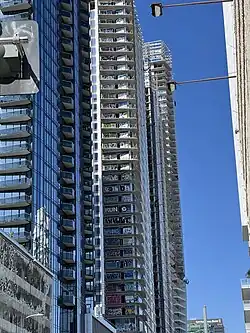 The three apartment towers began construction in April 2018. By January 2019, interior construction on the project was put on hold. The developer cited restructuring of capital and indicated work on the plaza would resume "shortly".[15][16][6] Contractor Lendlease suspended work until late March 2019, when it was announced that construction had resumed after nine active liens had been filed by subcontractors totaling US$98.6 million.[17] Due to the three-month pause in work, the opening date was delayed to an unknown date.[18] Work once again stopped in late 2019. Media reported that the towers were stuck in limbo over unpaid work and pending lawsuits.[19] The towers were an example of Chinese reductions in capital and investing in US real estate due to China's communist government's crackdown on capital flight due to its real estate financial crisis exacerbated by a US trade war.[4] Completion of work was reported to be uncertain and all work was put on hold in late 2019.[3]