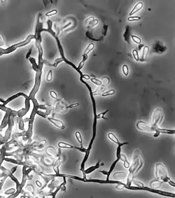 Ochroconis gallopava, also called Dactylaria gallopava or Dactylaria constricta var. gallopava, is a member of genus Dactylaria. Ochroconis gallopava is a thermotolerant, darkly pigmented fungus that causes various infections in fowls, turkeys, poults, and immunocompromised humans[1][2][3][4] first reported in 1986.[2] Since then, the fungus has been increasingly reported as an agent of human disease[2] especially in recipients of solid organ transplants (e.g., liver, kidney, heart, and lung).[1][2][3][4] Ochroconis gallopava infection has a long onset and can involve a variety of body sites.[5] Treatment of infection often involves a combination of antifungal drug therapy and surgical excision.