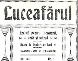 In 1902, Tăslăuanu was named a secretary at the Romanian consulate in Budapest.[6] Somewhat unusually for a member of the country's diplomatic service, he did not hold Romanian citizenship at the time.[7] While there, he edited and corrected articles for Luceafărul, as well as writing original work, and began a close friendship with Octavian Goga, for whom he managed to create an environment that fostered Goga's poetic creativity. The following year, he became head editor at the magazine, which due to his initiative emerged as a voice for younger writers, in particular Goga, then reaching the peak of his creativity.[6] By 1904, he was owner as well as editor of Luceafărul. In 1905, he attended celebrations at Sibiu marking the opening of the ASTRA Museum. There, he met Adelina Olteanu, the sister of officer Marcel Olteanu.[8][9] Adelina was a former Luceafărul contributor whom Goga intended to marry. She and Tăslăuanu fell in love and became engaged, marking the first break with Goga. On June 17, 1906, the couple married, and that year, he moved the Luceafărul headquarters from Budapest to Sibiu, the first issue appearing there in October. Also that autumn, he became administrative secretary of ASTRA,[9] as well as signing a contract stipulating Goga would be director of Luceafărul and Tăslăuanu editor-in-chief.[10]