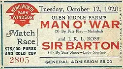 - In a two horse race between the most successful Throughbreds in North America, once-beaten Man o' War competed against 1919 Triple Crown winner Sir Barton at Kenilworth Park Racetrack in Windsor, Ontario. The prize for winning the Kenilwoth Cup was a record $75,000, with a gold trophy valued at an additional $5,000.[60]