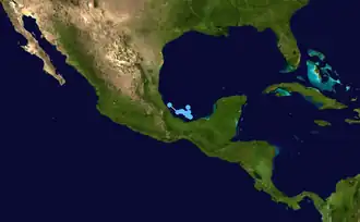 On October 4, Tropical Depression Eleven developed in the Bay of Campeche about 145 mi (233 km) northeast of Veracruz, having originated from a tropical wave. Due to weak steering currents, the depression moved erratically, initially to the south and later to the west-northwest. It failed to intensify due to a surface trough over the central and eastern Gulf of Mexico,[6] connected to a cold front. While the depression was drifting, it produced large areas of convection over eastern Mexico,[7] aided by high humidity from the gulf and from the Pacific Ocean.[8] On October 6, the circulation was absorbed into the trough,[6] although rainfall continued to occur through October 9.[4] A week later, Hurricane Irene affected southern Mexico with strong rains.[9] Additional rainfall occurred on October 18 in Tabasco, causing further flooding; the waters in the state began receding on October 28.[10] The wet conditions in eastern Mexico, occurring at the same time as hot, dry conditions elsewhere in the country, were possibly related to La Niña conditions.[11]