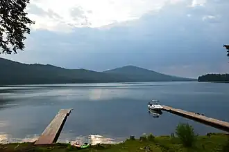 The populated place of Odell Lake, Oregon, is on the lake's southeast end at 43°32′56″N 121°57′53″W / 43.549013°N 121.964752°W and was once a station on the Southern Pacific Railroad's Cascade Line between Crescent Lake station and Cascade Summit.[3][4][5] The place was also known as Odell Lake Resort, and today is the site of Odell Lake Lodge.[4] The historic lodge building was constructed in 1903.[6] In the 1930s on the west end of the lake another resort, Shelter Cove Resort which includes cabins, camping sites, RV parking, and docks for boating.[7][8]