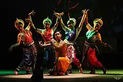 The traditional Odissi repertoire, like all classical Indian dances, includes Nritta (pure dance, solo), Nritya (dance with emotions, solo) and Natya (dramatic dance, group).[61][62] These three performance aspects of Odissi are described and illustrated in the foundational Hindu texts, particularly the Natya Shastra, Abhinaya Darpana and the 16th-century Abhinaya Chandrika by Maheshwara Mahapatra of Odisha.[61][62]