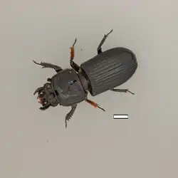 Odontotaenius disjunctus, the patent-leather beetle or horned passalus, is a saproxylic beetle in the family Passalidae (bess beetles) which can grow to over 3 cm long, weigh 1-2 grams and are capable of pulling 50 times their own weight.[2] They have been used to study several aspects of general family characteristics since the early 1900s but remain a relatively unknown species within the diverse Coleoptera order.