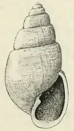 The large shell large measures 7.5 mm. It is umbilicated, yellowish-white. The nuclear whorls are decollated. The six post-nuclear whorls are decidedly, slopingly, tabulatedly shouldered at the summit, otherwise moderately rounded. They are marked by fine incremental lines and numerous, equal and equally spaced, slender, wavy, spiral threads, of which 6 occur upon the shoulder, and about 40 between the shoulder and the suture. The periphery and the moderately long base of the body whorl is well rounded, marked like the spire. The ear-shaped aperture is moderately large. The posterior angle is obtuse. The inner lip is moderately long, stout, curved, somewhat reflected, provided with a strong fold a little anterior to its insertion. The parietal wall is glazed with a thin callus.[3]