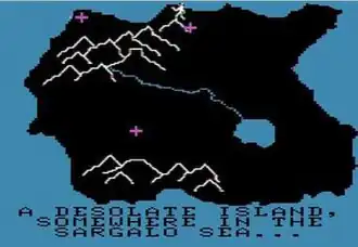 The map of islands in the Sargalo Sea in which you navigate your ship consists of a ring of islands around the perimeter of the screen.[1]: 9 Your ship starts out next to the island you just left (in the lower right of the screen) while "Lapour", the island now held by the Caliph (your goal) is in the upper left. You may land on other islands to stock up on food and resources but for the most part these islands are not fully explorable as the first one was, and serve only as places to stock up on supplies by displaying a few lines of text after you land (with one exception—see below). Navigation is a complex scheme, as you are at the mercy of wind and currents (and whether the vessel has any intact sails left) and you cannot navigate directly as you can in early Ultima titles. You must set the sails in different directions in order to catch the wind, and raise and lower anchor to start and stop your ship. Hazards include running aground if the player weighs anchor too close to shore, being caught in a whirlpool which may destroy the ship or destroy its sails, scurvy among the crew, calm winds (which is harmless to the ship but prevents any progress until the winds start up again) and falling off the edge of the world if the ship gets too close to the edge of the map.
