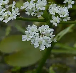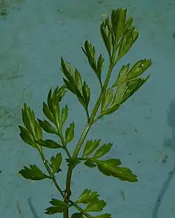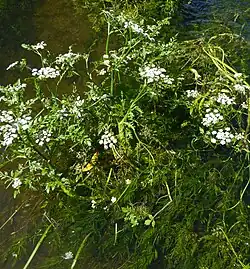The lower, underwater leaves are once to twice pinnate, with distinctive cuneate (diamond shaped) segments which are deeply divided into almost linear lobes (especially so in faster-flowing water), with petioles as long as the leaf. These submerged leaves remain green throughout the winter but the plants are much reduced, hugging the bottom of the channel. In the summer, the upper, aerial, leaves sometimes form: they are 1-3 times pinnate with ovate, lobed segments about 1 cm long, and have petioles about one third the length of the blade. The petioles on both forms are solid and produce a sheath around the stem at their base.[1]
