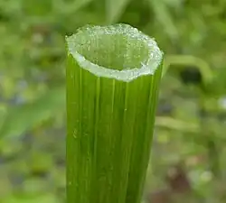 River water-dropwort is a hairless perennial with hollow, ridged stems up to 1 m long, submerged or floating in rivers, or emergent in marginal swamps and during periods of low flow in summer. The stems creep along the surface of mud, or on the bottom of a river, rooting at the nodes. These extend upwards through the water column, becoming thicker as they ascend, to a diameter of about an inch (2.5 cm), with a central hollow about half that size. Young plants have tubers, which disappear as they mature, leaving just fibrous roots.