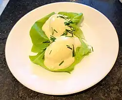Oeuf mayonnaise, sometimes shortened to oeuf mayo, is a simple French egg dish. It is an hors d'oeuvre and is considered a classic bistro dish. A recipe was included in the 1936 cookbook L'Art culinaire moderne by Henri-Paul Pellaprat, which was first translated for American cooks in 1966 as Modern French Culinary Art.[1]