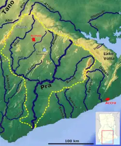 The Ofin and the Pra rivers form the boundary between Ghana's Ashanti region and Central region. Dunkwa-on-Offin is a major town on the river.[1]
