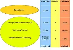 - ^ The example above is a simplified and graphic version of one of the best examples of offsets by the U.S. Department of Commerce: "OFFSET EXAMPLE: This example is for illustrative purposes only and in no way represents an actual offset agreement. The fictitious nation of Atlantis purchased ten KS-340 jet fighters from a U.S. defense firm, PJD Inc. (PJD), for a total of $500 million with a 100 percent offset. In other words, the offset agreement obligated PJD to fulfill offsets equal to the value of the contract, or $500 million. The government of Atlantis decided what would be required of PJD in order to fulfill its offset obligation, which would include both direct and indirect compensation. The government [of Atlantis] also assigned the credit value for each category." BIS example then illustrates the fulfillment of the offset agreement with direct and indirect offset. See U.S. Department of Commerce, Bureau of Industry and Security Offsets in Defense Trade, Eleventh Report to Congress, 2007, Appendix G, Glossary and Offset Example Archived 2011-09-27 at the Wayback Machine