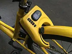 Customers use the company's mobile app on their smartphones to locate nearby bicycles. Each bike has a QR code on the frame, which the customer scans to unlock the bike. ofo bike unlocking is also available on other collaborative apps such as WeChat and Alipay in Mainland China.[58] Each yellow bicycle reports its location via satellite positioning, allowing users to see which bikes are available nearby. Users pay within the app using available payment methods such as credit cards, WeChat Pay or Alipay in China, etc. After customers are finished, they can leave the bike anywhere and lock it. The bicycles use NarrowBand IOT to power the locks, developed by Huawei and China Telecom.[59]