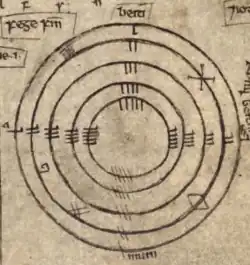 Cend a muine/Head in Bush: This involves writing a letter to stand in for the whole letter name at the beginning of a word when possible e.g., to write simply CLE for certle or 'ball of thread'.