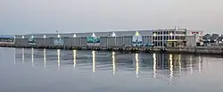 The 12-hectare (30-acre) port facility has two finger piers designated Pier A (to the south) and Pier B (to the north).[9] Berths on each pier are designated North and South. South A extends for 335 metres (1,100 ft), North A extends for 243 metres (800 ft). Pier B berths were extended to 317 metres (1,040 ft) by installing a mooring dolphin in 2009. Each berth can accommodate a vessel with a draft in excess of 10 metres (33 ft) at low tide.[9] Although there are four berths, a maximum of three ships can be accommodated in port at any one time due to the close proximity of North A and South B. Canada Border Services Agency facilities are located at each pier. Pier A also houses a 9,290-square-metre (100,000 sq ft) warehouse, complete with cable ship spooling apparatus and cable storage facility.