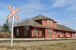 Ogema's original train station stood at the south end of Main Street on the north side of the railway tracks. Construction began on a train line from Weyburn to Assiniboia in 1909. By 1912 the line reached Ogema which was the midway point,[44] and was completed in 1912. After passenger use declined and the station closed down, it was removed from the site and sold for scrap in the 1960s. In the early 2000s a committee was struck to oversee the return of a 1912 CPR train station to the original site. And in 2002, a station, being used as a grain bin at the time, was located and transported from Simpson, SK to Ogema. Over the next seven years, 1,000 of hours of labour were put into the station and, in the summer of 2009, it was opened to the public, nearly fully restored and furnished with original furniture and artifacts. Today, the Station has been fully refurbished and Southern Prairie Railway runs historical train tours from Ogema.[45]