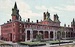 The Oglethorpe Hotel, located in downtown Brunswick, Georgia, was designed in 1888 by architect J. A. Wood and named after James Oglethorpe.[1] It was built on top of the previous Oglethorpe House, which was burned during the Civil War.[2] It was constructed of brick and had three main levels. The building was capped by conical towers at the corners and in the center.[3]
