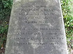 Thomas Ogle's restored gravesite commemorates the Ogletown area and the Ogle family influence, however, it is poorly maintained with no visible emphasis on history, place making and public access.[8] Advocates, in conjunction with the group Ogletown Resilience, and Delaware Public Archives, began an effort to recognize Ogletown, given the anniversary of Thomas Ogle's death in 1771, 250 years ago. Advocates submitted an application asking that a historical marker be added to the gravesite, and approval was granted on March 10, 2022.