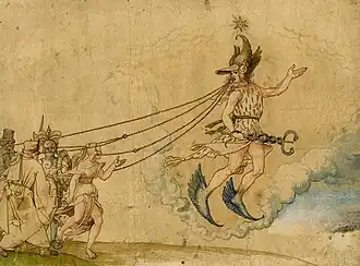 The reception of Lucian's ekphrasis of Hercules Ogmios in the Renaissance has been described as "astonishingly rich".[3]: 95 Such sources such as Andrea Alciato's much-read Emblemata and the mythographies of Annius of Viterbo and Natalis Comes popularised the myth of "Gallic Hercules" among humanists and artists.[35]: 242–248 In France, Gallic Hercules was regarded as a founder of the nation, and associated with the French monarchy.[35]: 245–250 A sculpture of Francis I as Ogmios, binding the Four Estates by his tongue, was unveiled in Paris upon the entry of Henry II in 1549.[36]: 426 Albrecht Dürer's rendition of Ogmios as Hermes (pictured above) is well known, but there is also a drawing from the School of Raphael, a wall painting in the Escurialense, and a very large number of printed woodcuts.[3]: 95