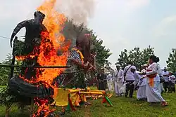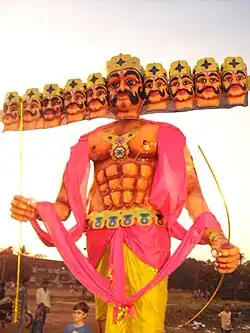 The distinctive characteristics of ogoh-ogoh have led netizens to compare it with other traditions involving giant effigies.[66] One example is the Vijayadashami festival (Hindi-Urdu: Dassahra; alternative spelling: Dussehra) celebrated by Hindus in India.[67] Unlike Nyepi, this festival is not a New Year celebration but a commemoration of Rama's victory over Ravana as told in the Ramayana epic. The festival culminates in the burning of effigies of figures considered symbols of evil, similar to the ogoh-ogoh tradition.