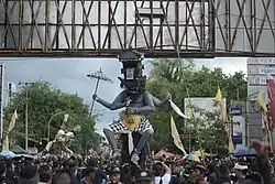 In its development—especially during the 1990s and 2000s—many ogoh-ogoh designs drew inspiration from popular culture and contemporary issues of the time.[7] Some were even made to resemble public figures such as celebrities, politicians, and even convicts.[13] In more traditional competitions, ogoh-ogoh makers were indirectly required to explore Hindu and Balinese mythology as sources of inspiration. However, the creativity of the Balinese people remained under government and customary institution supervision. Authorities monitored the ogoh-ogoh created by the community and banned those deemed to contain elements of ethnicity, religion, race, and politics (SARA).[14] During political years in the 1990s and 2000s, the ogoh-ogoh parades were sometimes prohibited by local governments.[15][16] Despite this, some communities continued to create them, though in smaller numbers, believing that ogoh-ogoh was both a tradition and an outlet for artistic expression.[15][16][17]