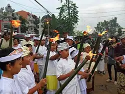 At dusk after the Mecaru ritual, Balinese Hindus perform Pangrupukan. This activity is marked by lighting torches or burning dried coconut leaves (in Balinese: mebuu-buu) and making loud noises using instruments like kentungan, tawa-tawa, cengceng, or other musical alternatives while walking around their homes or villages. The purpose is to drive away evil forces or negative influences from the surroundings.[48] Pangrupukan is often accompanied by the ogoh-ogoh parade, representing the negative traits within humans, embodied as butakala (malevolent beings). The ogoh-ogoh are then burned as a symbolic act of destroying these negative traits.[49] This procession is comparable to exorcism from a Western cultural perspective.[48]