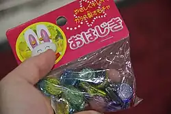 Ohajiki (おはじき) is a traditional Japanese children's game similar to marbles. It is played with small coin-shaped pieces also called ohajiki. Modern pieces are typically made of glass or plastic, but in the past seashells, pebbles, and Go stones were used. It is traditionally considered a game for girls.[1]