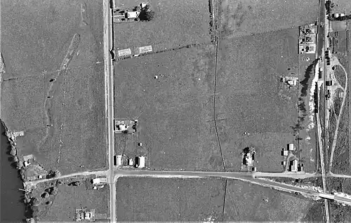 ![]() 1940 aerial view of the Waikato River (left), Great South Rd at Ohinewai and Ohinewai railway station (right). The Waikato Expressway now runs through the centre | |||||||||||