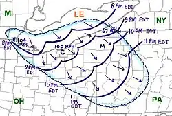 ![]() The Ohio Fireworks Derecho was one of the first bow echos and line echo wave patterns to be radar-documented. | |