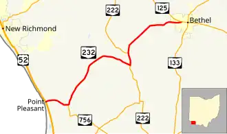 State Route 232 (SR 232, OH 232) is an east–west state highway situated in the southwestern corner of the U.S. state of Ohio. The western terminus of State Route 232 is at a T-intersection with U.S. Route 52 in the unincorporated community of Point Pleasant near the Ohio River. The eastern terminus of this highway is at a signalized intersection with State Route 125 in the village of Bethel.