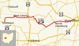 State Route 245 (SR 245) is an east–west state highway in the western portion of the U.S. state of Ohio. The western terminus of SR 245 is at an intersection with SR 29 near Rosewood. Its eastern terminus is at an exit ramp with U.S. Route 33 (US 33), US 36, and SR 4 in Marysville.
