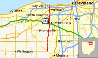 State Route 252 (SR 252) is a 23.04-mile (37.08 km) long north–south state highway in the northern portion of the U.S. state of Ohio. The southern terminus of this state route is at a signalized intersection that marks the western split of the concurrency of SR 18 and SR 57 nearly 1.25 miles (2.01 km) northwest of the city limits of Medina. SR 252 has its northern terminus at a T-intersection with U.S. Route 6 (US 6) in the western Cleveland suburb of Bay Village.