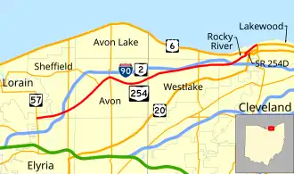 State Route 254 (SR 254) is a 17.15 miles (27.60 km) east–west state route in northern Ohio. The route begins at State Route 57 in Lorain and ends at U.S. Route 20 in Lakewood. SR 254 intersects Interstate 90 twice, both times near its endpoints. State Route 254 is known as Detroit Road for most of its routing, and as North Ridge Road at its western end.