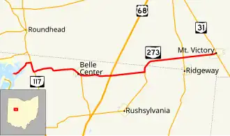State Route 273 (SR 273) is a two-lane east–west state highway in Logan and Hardin counties in the U.S. state of Ohio. It begins at an intersection with State Route 31 in Mt. Victory, passes through Belle Center, and ends in a dead end on Long Island at Indian Lake. Along the way, it intersects State Route 292 (north of Ridgeway), State Route 274 (north of the crossroads of Big Springs), US 68 (at the former location of Whitestown, today occupied only by a butcher's shop), and State Route 638 (in Belle Center). It overlaps State Route 117 for a short distance near Indian Lake.