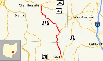 State Route 284 (SR 284, OH 284) is a north–south state highway in east central Ohio, a U.S. state. State Route 284 has its southern terminus is at State Route 83 approximately 8 miles (13 km) northeast of McConnelsville, and just 0.25 miles (0.40 km) north of the western split of the concurrency State Route 83 has with State Route 78. The northern terminus of State Route 284 is at a T-intersection with State Route 146 in the unincorporated community of Chandlersville. A portion of SR 284 is part of the Morgan County Scenic Byway.