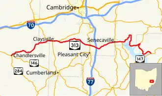 State Route 313 (SR 313, OH 313) is a 34.38-mile (55.33 km) long east–west state highway located in the southeastern portion of the U.S. state of Ohio. The western terminus of SR 313 is at a T-intersection with SR 146 approximately 9.50 miles (15.29 km) northwest of the village of Cumberland. Its eastern terminus is near the eastern end of Senecaville Lake at a T-intersection with SR 147 nearly 3.50 miles (5.63 km) southwest of Batesville.