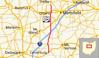 State Route 314 (SR 314) is a north–south state highway in the northern portion of the U.S. state of Ohio. The southern terminus of SR 314 is at a T-intersection with the duplex of U.S. Route 36 (US 36) and SR 3 in Centerburg. Its northern terminus is at a T-intersection with State Route 61 less than 1 mile (1.6 km) south of the city limits of Shelby.