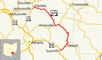 State Route 329 (SR 329) is a state highway located in southeastern Ohio. The route is signed as a north–south route though the shape of the road is more of a backwards C. The southern terminus of SR 329 is in the Rome Township community of Guysville at US 50 and SR 32. After traveling north through the Athens County communities of Stewart and Amesville, the route briefly enters Morgan County before re-entering Athens County and ending at SR 13 in the village of Trimble.[4]