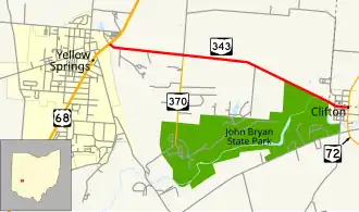 SR 343 commences from a signalized intersection with US 68 in Yellow Springs. SR 343 generally traverses a rural backdrop through Miami Township, Greene County with a mix of woods and open fields, and the occasional house along the way. About one mile (1.6 km) east of US 68, SR 343 meets SR 370, the primary access route to John Bryan State Park, at its northern terminus. SR 343 continues east, then starts to trend southeasterly, brushing the northeastern portion of John Bryan State Park just prior to entering Clifton. Upon crossing into Clifton, SR 343 briefly ducks into Clark County, but re-enters Greene County, as it turns easterly, following North Street through the village prior to coming to an end at a T-intersection with SR 72.[2]