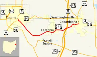 State Route 344 (SR 344) is an east-west state highway lying entirely in Columbiana County, Ohio. Its western terminus is at State Route 14 and State Route 9 in downtown Salem, and its eastern terminus is along a concurrency with State Route 164 in downtown Columbiana.
