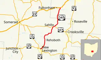 State Route 345 (SR 345) is a north–south state highway in the eastern portion of the U.S. state of Ohio. The southern terminus of SR 345 is at a signalized intersection with the SR 13/SR 37 concurrency in New Lexington. Its northern terminus is at a T-intersection with U.S. Route 22 (US 22) in the unincorporated community of East Fultonham.