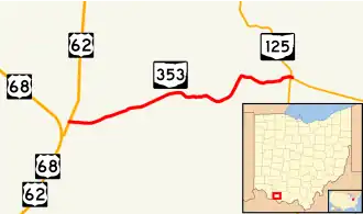 State Route 353 (SR 353) is an east–west state highway in southwestern Ohio, a U.S. state. Its western terminus is at U.S. Route 62 (US 62) about four and a half miles (7.2 km) south of Russellville, and its eastern terminus is near the unincorporated community of Decatur at SR 125. The entire route is a two-lane highway, passing through farmland and woodland. The route was commissioned in the mid-1930s and was paved in the mid-1950s.