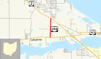 State Route 358 (SR 358) is a 0.92-mile-long (1.48 km) north–south state highway in the northern portion of the U.S. state of Ohio. The southern terminus of SR 358 is at a T-intersection with SR 163 nearly 5.75 miles (9.25 km) east of Oak Harbor, just north of the Portage River. Its northern terminus is at SR 2 at an intersection just outside Camp Perry about three and a half miles (5.6 km) west of Port Clinton.